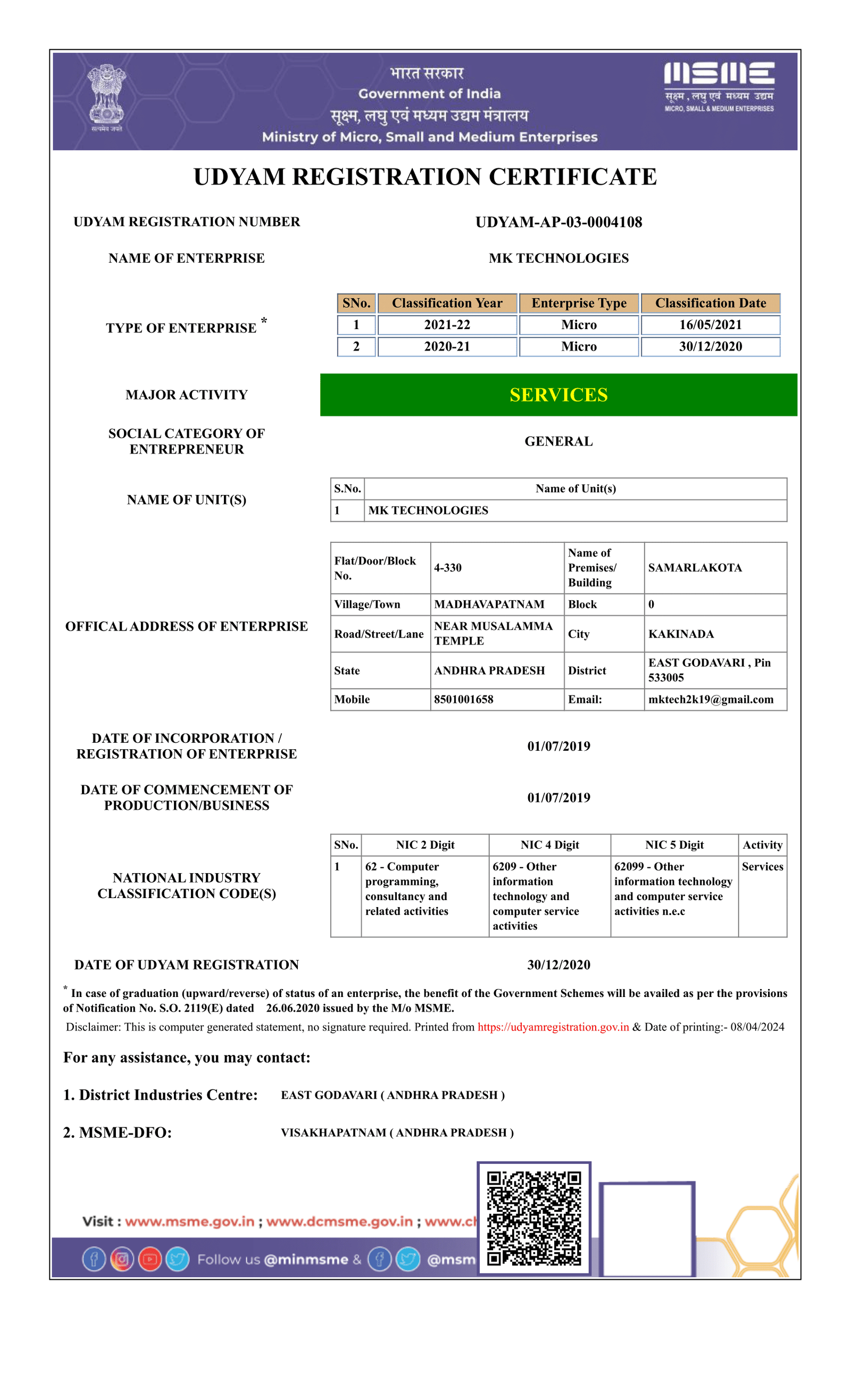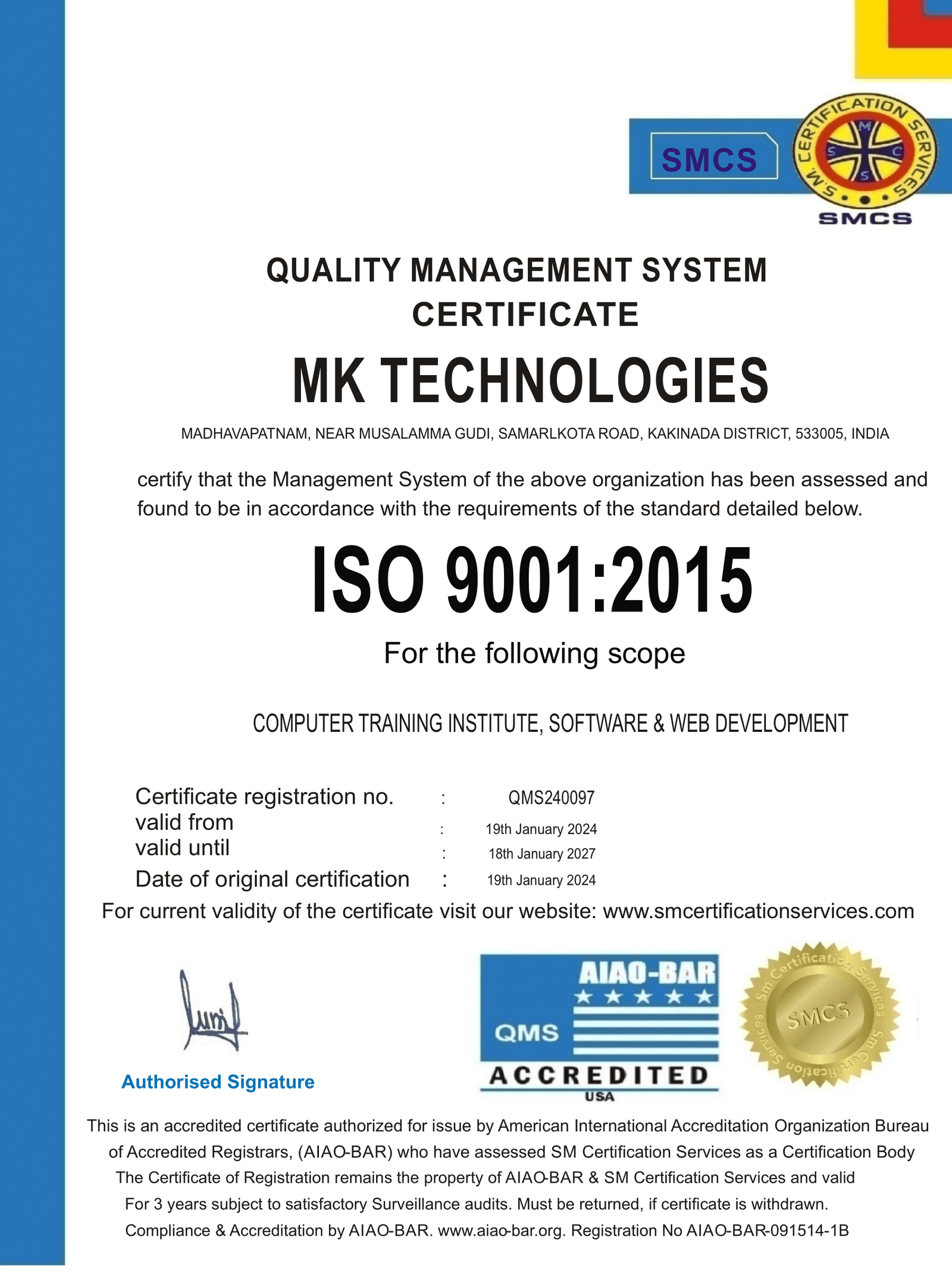 Madhavapatnam, Kakinada, 533005MK TECHNOLOGIE, an ISO 9001-2015 Certified Institute, offers high-quality computer education with guaranteed private job placements. Their training emphasizes "learning" over "teaching" using a well-equipped lab for both theoretical and practical sessions. We have fostered a friendly learning environment with the latest technologies over the past five years.